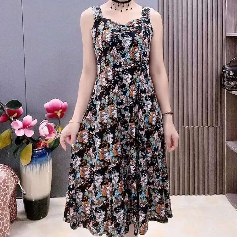 Women’s Vintage Floral V-Neck Slip Midi Dress – Summer Casual A-Line Waist Elegant Fashion