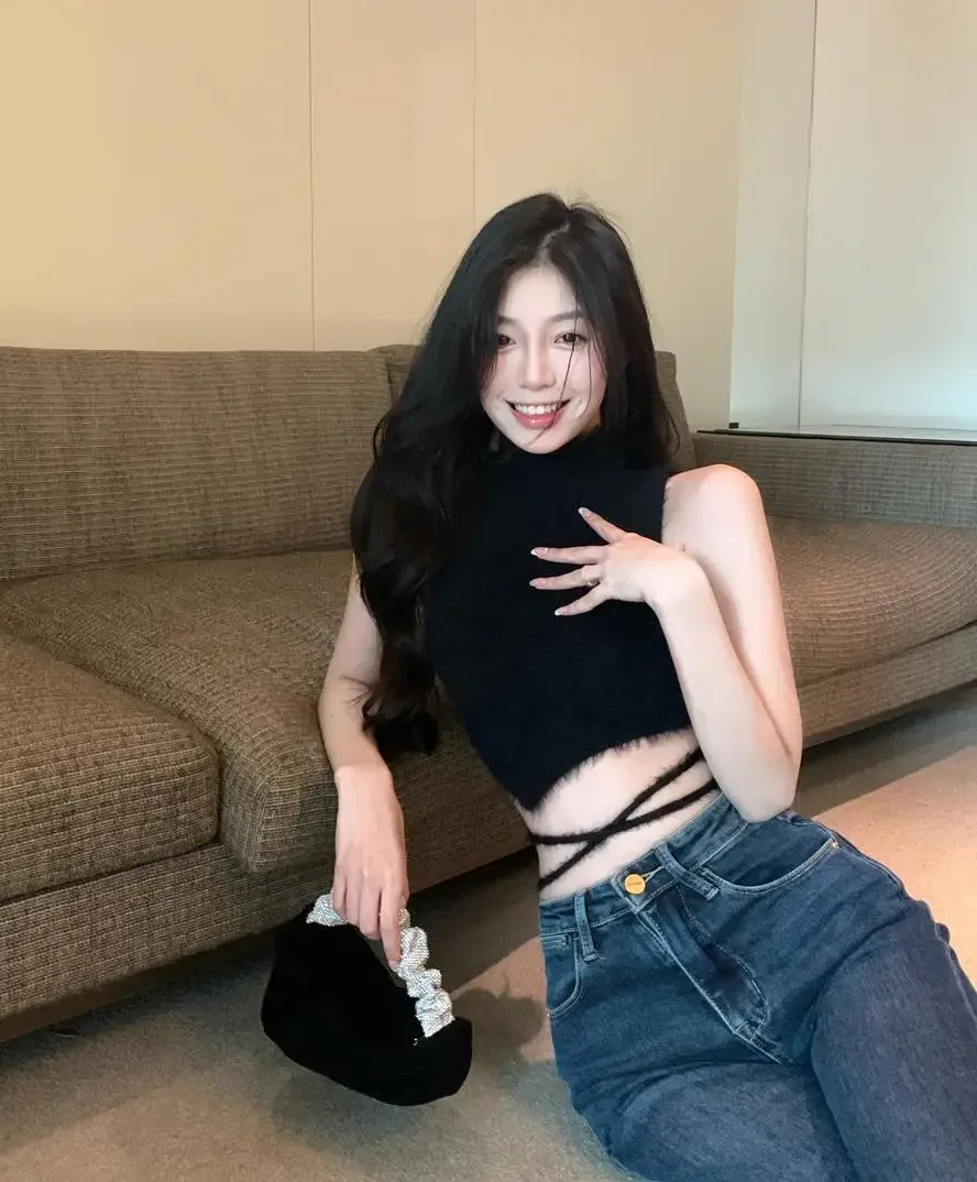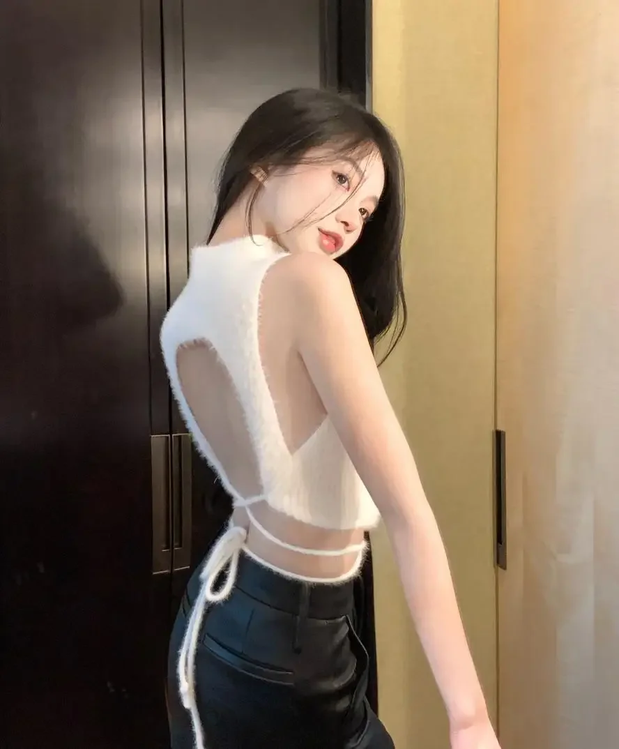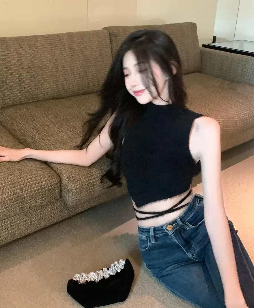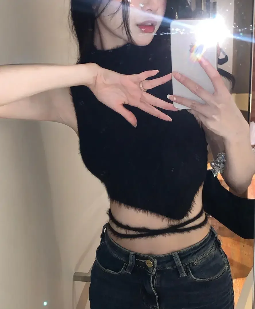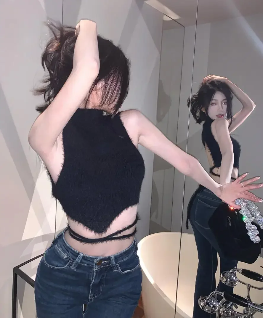 Women Knit Halter Crop Top Furry Lace Up Sleeveless